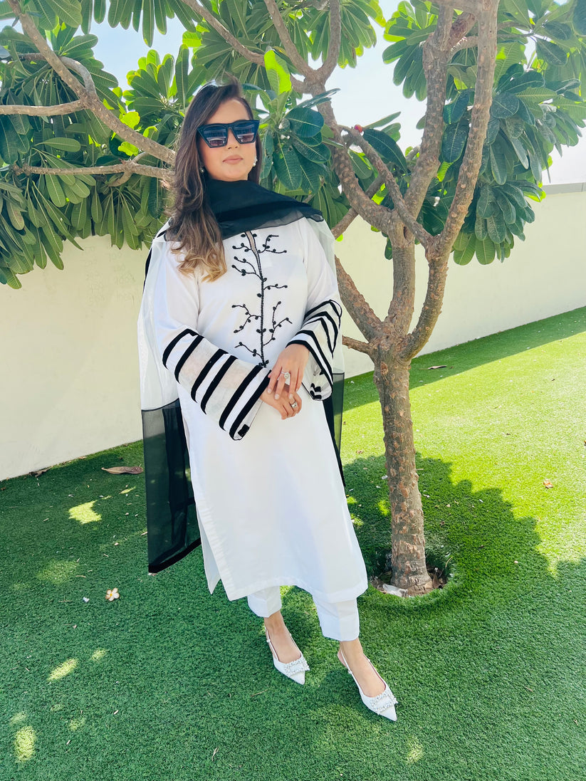 A two-tone black and white ombre dupatta with velvet borders, along with white silk straight pant complete the ensemble.