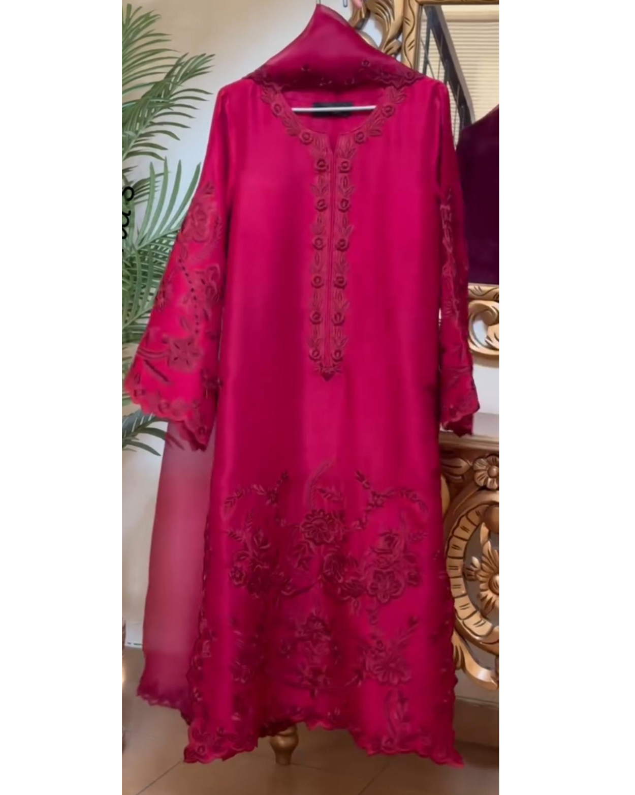 This is a premium quality soft imported silk 3-piece stitched ensemble.
