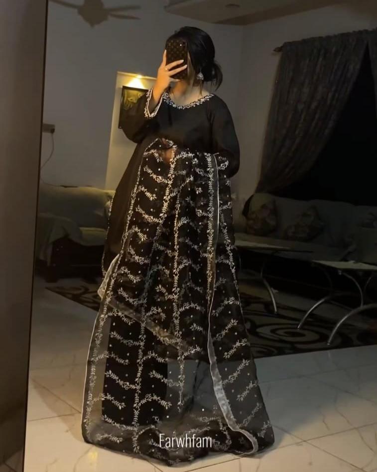Description: Indulge in the magic of ‘Pretty in Pink’ where a celestial dreamscape unfolds in soft shade of pink. Frosty Pink is a three piece stitched ensemble. A soft pink silk shirt with a delicate silver tilla sequinned embroidery and beads with pearls on the neckline, sleeves and border. It is paired with a wide legged silk pant. It comes with a heavily tilla embroidery and is sequinned all over on an organza dupatta adorned with tilla embroidery borders on all four sides.