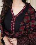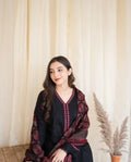 This is 3 piece embroidered outfit is a masterpiece of fashion paired with a solid culotte. The intricate floral embroidery showcase timeline beauty, topped off with a darker toned shawl with contrast embroidered detailing for a look that pure sophistication.