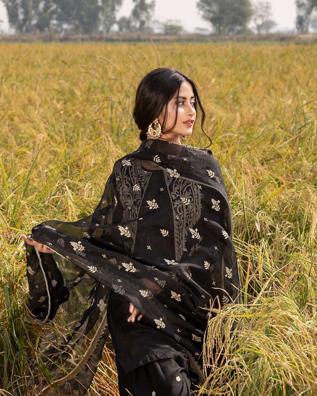 Indulge in luxury with the jacket’ 4-piece SLIK embroidered dress. Available in unstitched/stitched options, this ensemble radiates elegance. The set includes a captivating organza embroidered dupatta, elevating your style with its charm and grace.