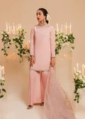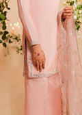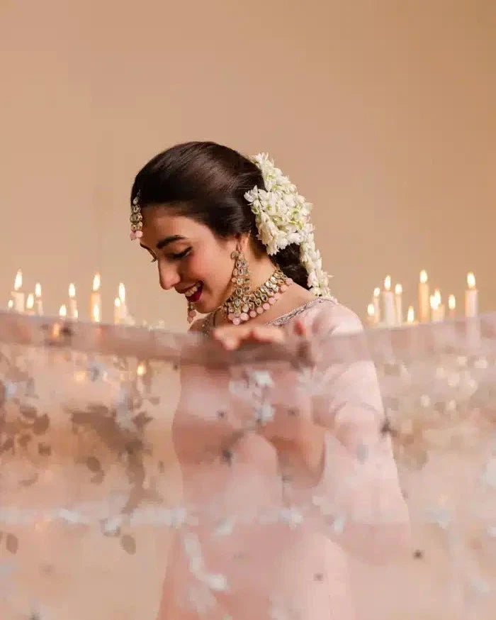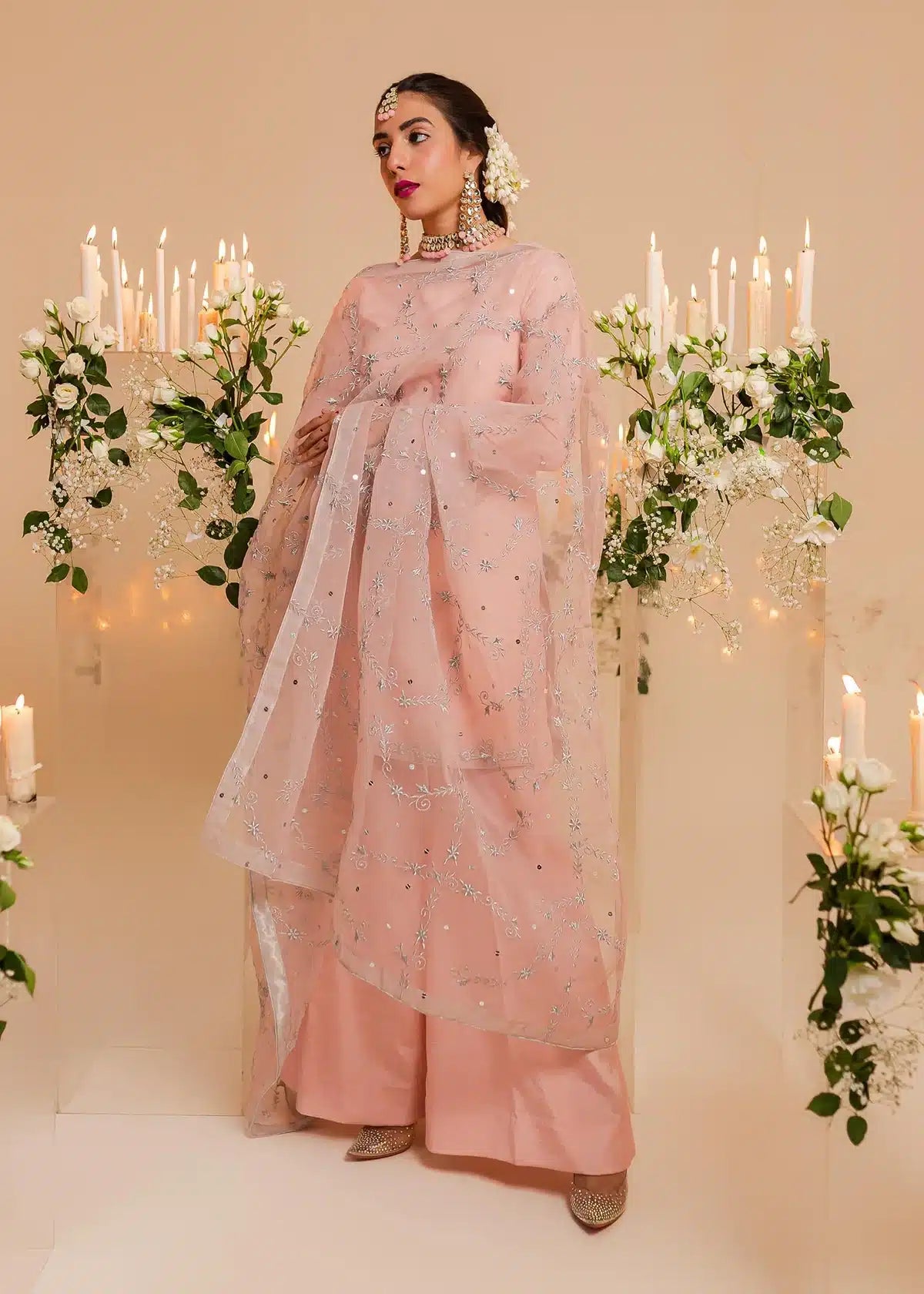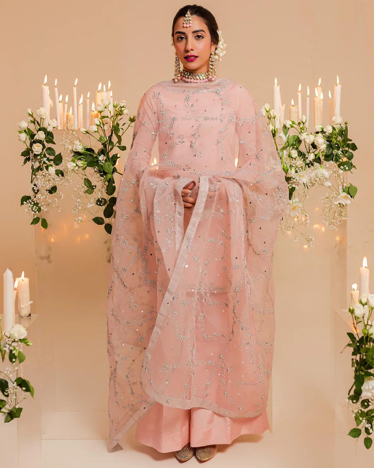 Description: Indulge in the magic of ‘Frosty Pink’ where a celestial dreamscape unfolds in soft shade of pink. Frosty Pink is a three piece stitched ensemble. A soft pink silk shirt with a delicate silver tilla sequinned embroidery and beads with pearls on the neckline, sleeves and border. It is paired with a wide legged silk pant. It comes with a heavily tilla embroidery and is sequinned all over on an organza dupatta adorned with tilla embroidery borders on all four sides.